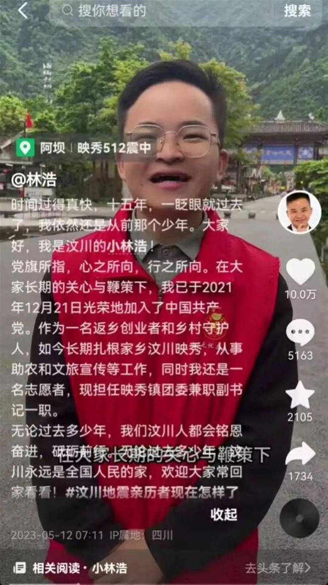 2008年,汶川大地震发生的时候,彼时只有9岁多一点点的林浩正好在当地镇上读小学二年级。