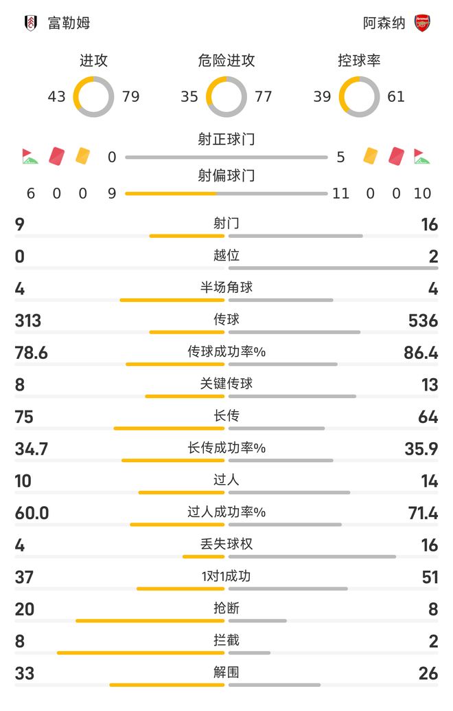 控球率方面,阿森纳达到61%,富勒姆则为39%。传球方面,阿森纳全场536次传球(关键传球13次),传球成功率86.4%;反观富勒姆全场313次传球(关键传球8次),传球成功率78.6%。