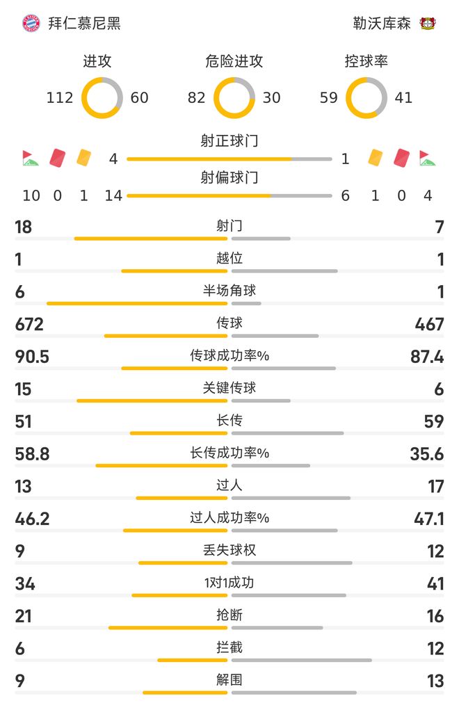 雷速体育11月2日讯 德甲第9轮,拜仁慕尼黑主场以3-0大胜勒沃库森。整场比赛里,拜仁在数据方面呈现着压倒性的态势,获得胜利实至名归。