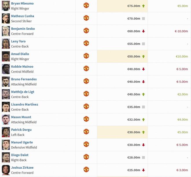 曼联球员身价变动:B费下跌至4000万欧,阿马德-迪亚洛上涨1000万欧